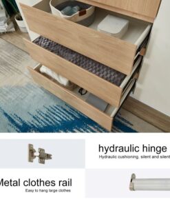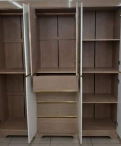 When it comes to design, the wardrobe features a classic two-tone white and oak finish. Furthermore, modern hidden-away golden handles complete the stylish look. The high-quality super-wood frame protects your clothes with smooth inner and outer surfaces. Notably, a light brown (raw wood) backboard adds a subtle natural accent that enhances its aesthetic appeal.