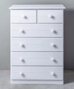 - Made from super wood and painted white. Material: The front, top, and sides are from sturdy 25mm super-wood boards, providing durability. However, the back panel is ‘raw’ Masonite board, which reduces overall weight. You will receive a strong, sturdy chest of drawers that will last.