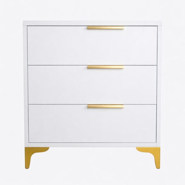 Bedside Table Golden legs, White, Three Drawers, Metal handles