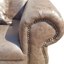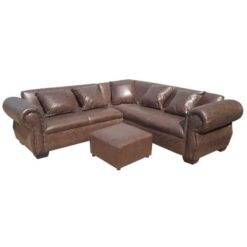 This L-shaped sofa has curved arms, fixed seat covers, and decorative studs, a timeless and classic design. Six people can comfortably sit on this corner couch. A child (young) can sit on the ottoman when more space is required.
