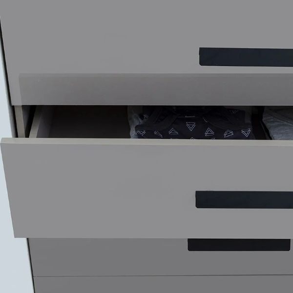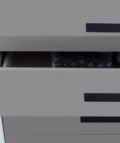 This cabinet features three doors, providing storage space for packing kitchen essentials. Similarly, the inside matches the outside—glossy grey/charcoal foil. Furthermore, the laminated work surface (top) offers easy cleaning and lasting durability. Also, all doors showcase modern silver handles.