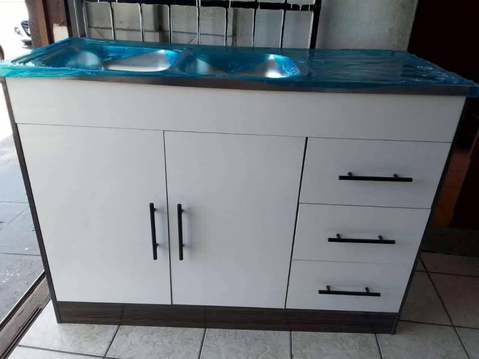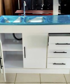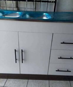 The price includes he cabinet, double sink, tap, and pipes. The cupboard has 3 doors. Approximate height reaches 0.9m, with a depth of 0.42m and a width of 1.2m. Modern silver handles complete the doors. The supplier includes the pipes as a complimentary feature. We advise that you use a certified plumber to handle the water system installation.