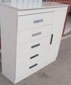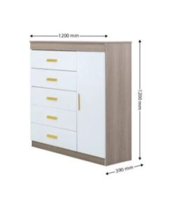 This light grey chest of drawers offers both style and functionality, featuring five smooth-gliding storage drawers and a single door with hanging space. Specifically, the drawers slide effortlessly on metal runners, while a shelf is behind the door.