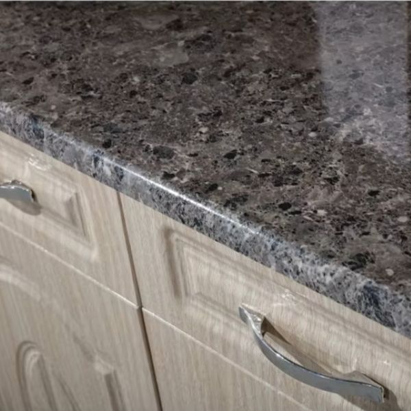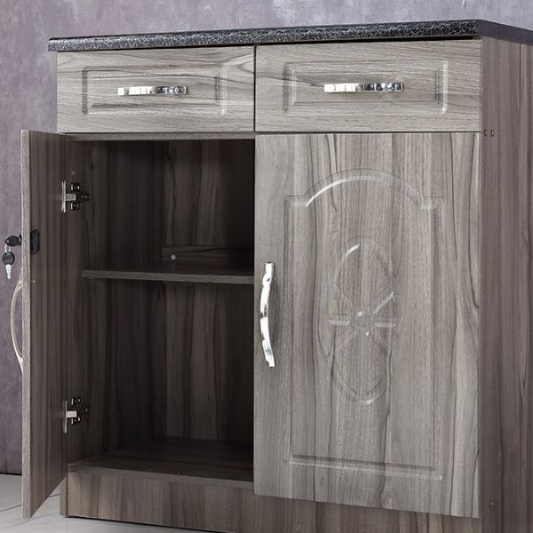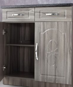 Similarly, the inside is the same as the outside—glossy grey/charcoal foil. Furthermore, the laminated work surface (top) is easy to clean and durable. The modern silver handles on the drawers look modern and stylish. Conversely, the back of the kitchen cabinet is light brown, raw Masonite colour.