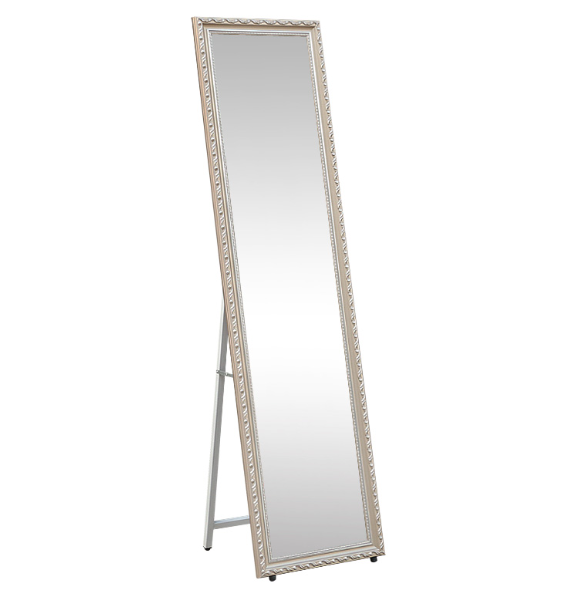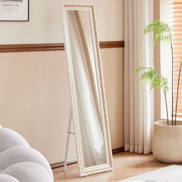 The mirror in the image immediately draws attention with its elegant, full-length design and decorative frame. To begin with, it measures approximately 1.5m in height and 0.4m in width, which provides a complete head-to-toe view. As such, it suits dressing rooms, bedrooms, hallways, or studio spaces perfectly. Moreover, the ornate frame features detailed floral-inspired carvings, which add a sense of luxury and timeless appeal. As a result, the mirror functions not only as a practical item but also as a striking décor piece.