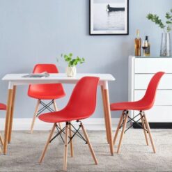With its timeless and modern style and compact footprint, this decorative chair fits effortlessly into any space. Furthermore, from dining rooms and offices to weddings, photo shoots, and lounge areas, it adds versatile charm. The modern red colour and wood-grain contrast create a sophisticated yet warm ambience, while the ergonomic silhouette ensures everyday comfort.
