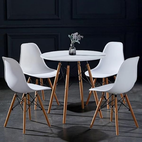 Elevate your interior style with this sleek white five-piece dining table set, expertly designed to blend comfort, durability, and aesthetic charm. Moreover, it features a smooth moulded plastic seat, solid beech wood legs, and a sturdy steel Eiffel-style support structure, delivering both function and elegance for any room.