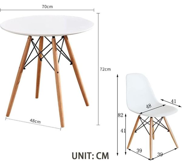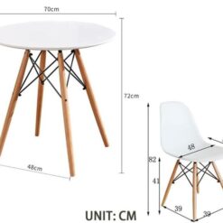 Modern bucket chairs with wooden legs. The tabletop has a diameter of 800mm and a height of 600mm. The table and chair legs are wood and supported by a star-shaped metal structure underneath and between the legs. The tabletop has round edges, ideal when small kids are in the house. This set is an ideal dining table and chair for a busy house since it is quick to clean and lightweight.