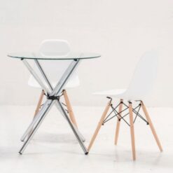 The chairs are white and curved. Made from white plastic with wooden legs and black metal cross-bracing to add strength. This metal crossbar between the legs enables the chair to carry weight. While the table legs are made of metal, the chair legs are made of wood. Furthermore, the round table has rounded edges for added safety and visual harmony.