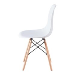 The chairs appear white, smooth, and curved. They feature durable white plastic seats with wooden legs and black metal cross-bracing for extra strength. This crossbar between the legs increases stability and supports additional weight. While the table legs use sturdy metal, the chair legs maintain a natural wooden finish. Furthermore, the round table’s soft edges ensure both safety and visual balance. Finally, you can quickly and easily clean the entire set with a damp cloth.