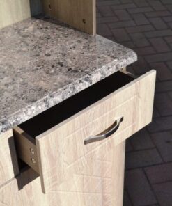 Each unit arrives fully assembled, so you can enjoy your new kitchen immediately without any extra work. In addition, the laminated grey marble work surface resists stains, cleans easily, and adds a touch of modern elegance. The drawers, fitted with sleek silver handles, provide convenient storage for everyday kitchen items.