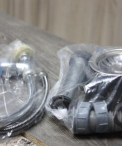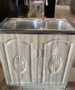 The price includes the cabinet, double sink, cold-water tap, and pipes. The cupboard has 2 doors. Approximate height reaches 0.9m, with a depth of 0.4m and a width of 0.8m. Modern silver handles complete the doors. The supplier provides the included pipes as a complementary feature. We advise that you use a certified plumber to handle the water system installation.