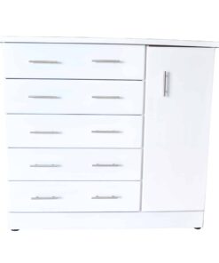 Expertly crafted with a sleek, modern design, the Confessions Chest of Drawers seamlessly blends style and functionality. To begin with, it offers five drawers with hanging space behind the door, providing ample space for everything from accessories to bulkier items such as clothes or linens. Additionally, each drawer glides effortlessly on metal tracks, allowing for easy and smooth opening and closing.