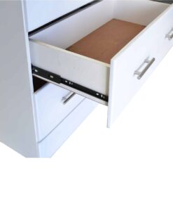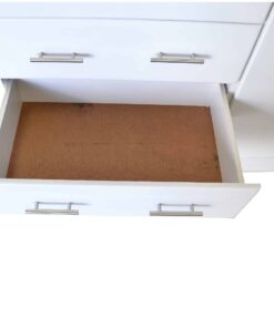 In terms of construction, manufacturers use super wood finished in a clean white tone, bringing a fresh, minimalist look that complements any room. At the same time, the light brown hardboard backing adds strength without unnecessary weight. Furthermore, the modern silver handles enhance the overall aesthetic, while the unit stands on small black legs, protecting it from water damage during cleaning.