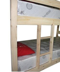 This bunker bed consists of a standard single (0.91m) at the bottom and the top. The wooden ladder ensures that it is easy to get to the top. The top bed has wooden safety rails on both sides. Wooden ladder included.